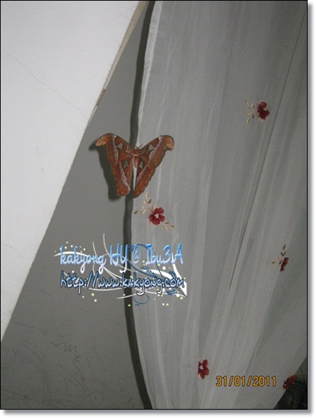 cantik kan.. tapi besor benor... geli pulak nengok nya... Aliya geram nengok rerama ni, digoncang2 nya langsir tu.. akhirnya rerama tu terbang lagi sekeliling hall.. tak jumpa jalan keluor, walaupun kami dah buka leluas pintu sliding tu..... sudahnya en ayah yang 'kutip' guna kertas rerama tu & antor dia keluor...